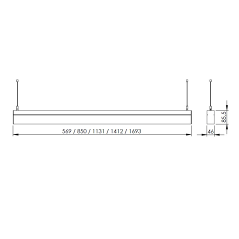 569-1693 mm standardně 2x lankový závěs 1,5m