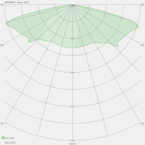 • V018 - Optika typu II/III (dlouhý) pro velmi velké vzdálenosti mezi sloupy. Ideální pro pěší cesty a obytné komunikace. Třídy P podle normy EN13201